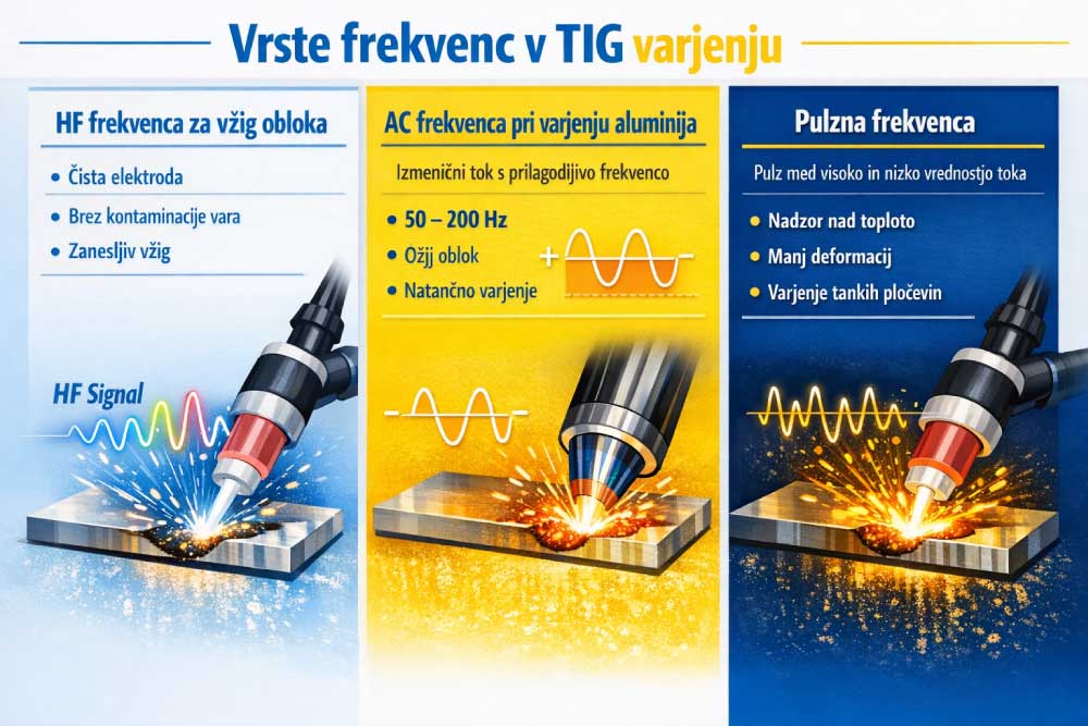 Ko govorimo o TIG varjenju, se pogosto osredotočimo na tok, elektrodo ali zaščitni plin. Vendar sodobni TIG varilni aparati omogočajo še precej več nadzora nad procesom. Eden izmed parametrov, ki postaja vedno pomembnejši, je frekvenca. Pri TIG varjenju frekvenca ni samo ena sama nastavitev. Pravzaprav obstajajo različne vrste frekvenc pri TIG varjenju, ki vplivajo na različne faze varilnega procesa. Vsaka ima svojo nalogo – od vžiga obloka do nadzora toplote med samim varjenjem.